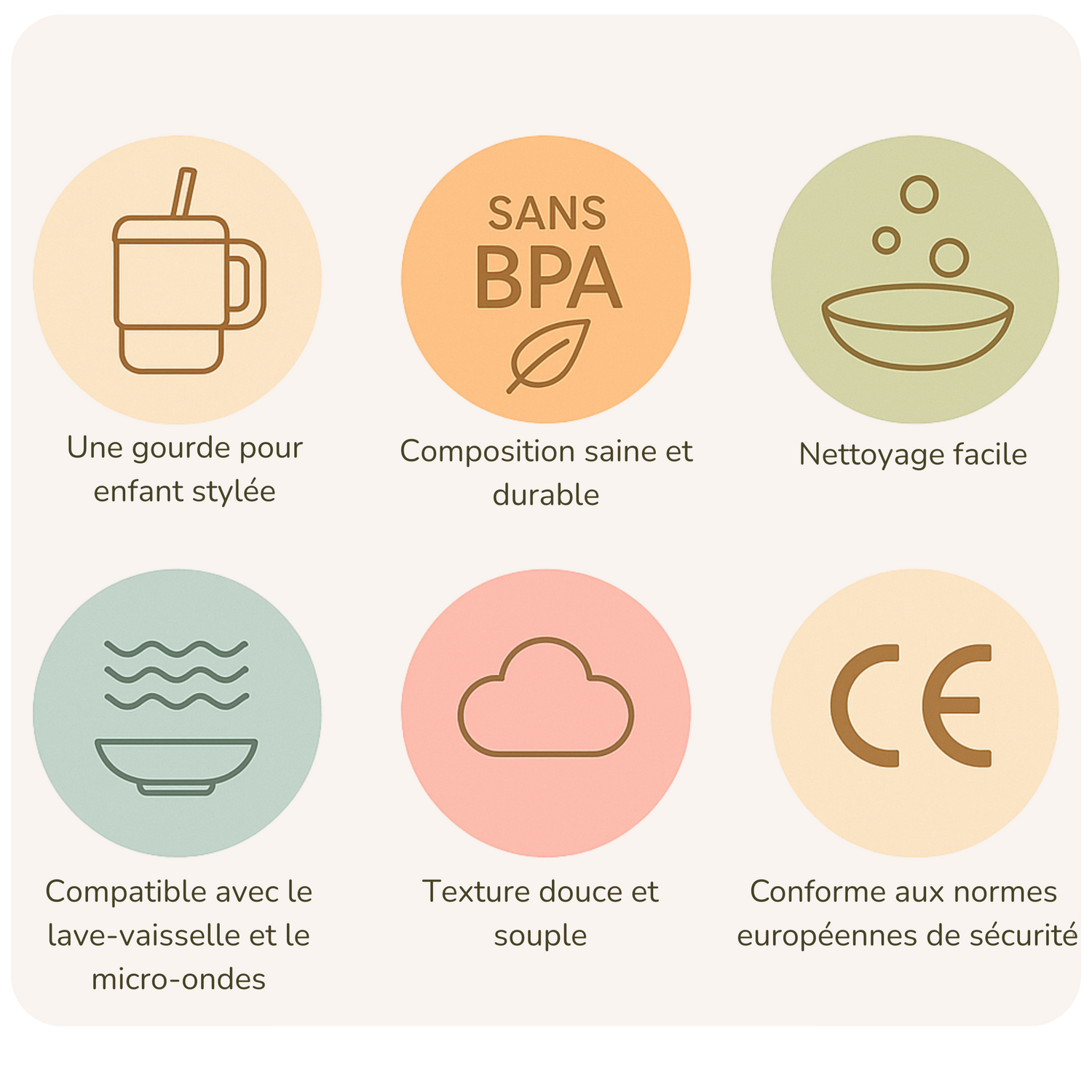 - Incassable & sûre : gourde d’apprentissage en silicone 100% alimentaire, sans BPA