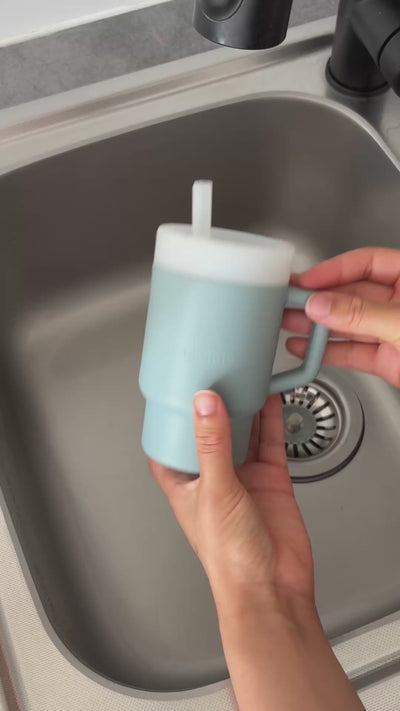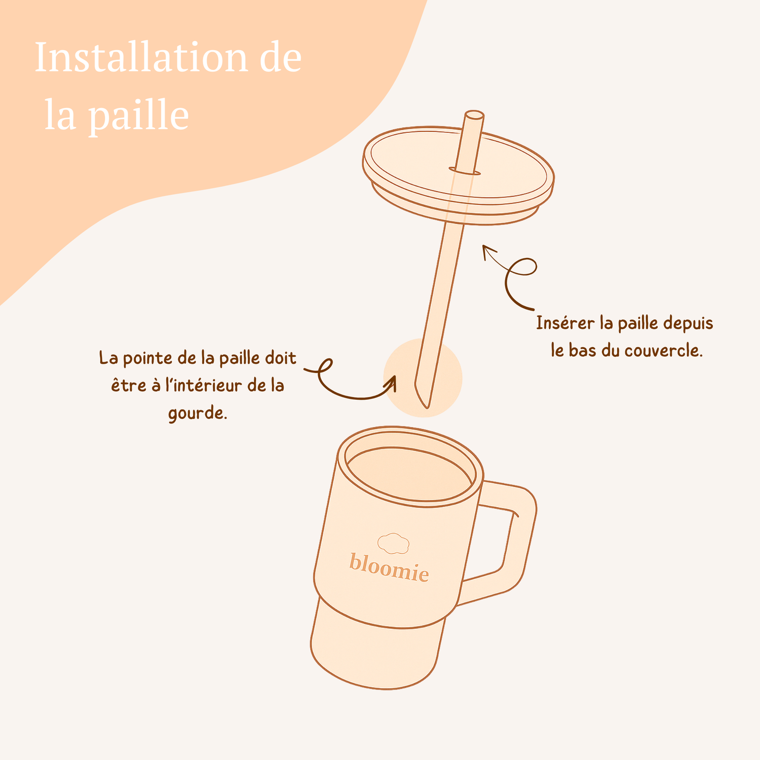 Insertion de la paille : insérez la paille par le bas du couvercle. L’embout en silicone bloque la paille pour plus de sécurité : bébé ne peut pas la retirer seul.