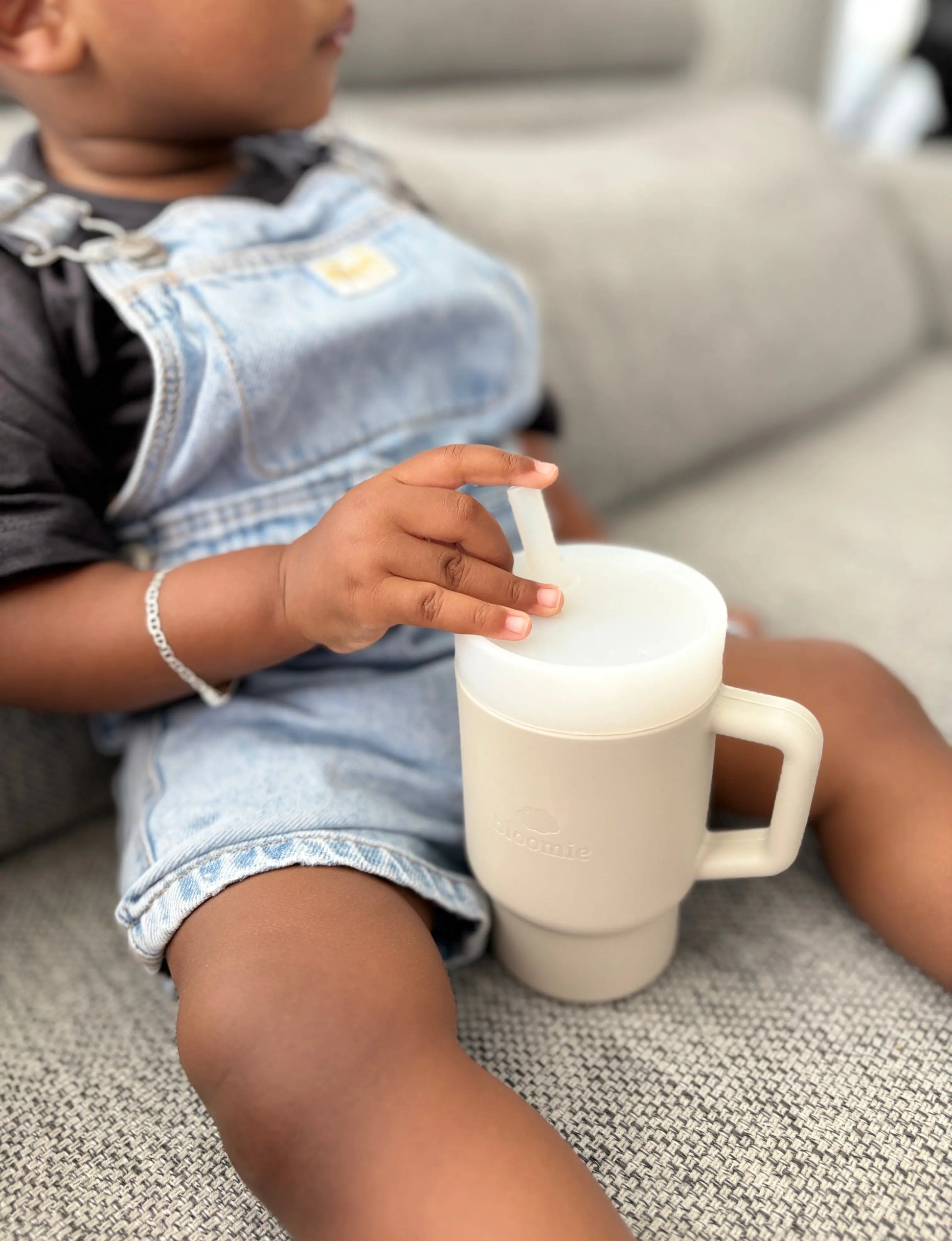 Insertion de la paille : insérez la paille par le bas du couvercle. L’embout en silicone bloque la paille pour plus de sécurité : bébé ne peut pas la retirer seul.
